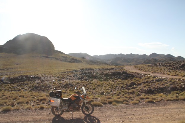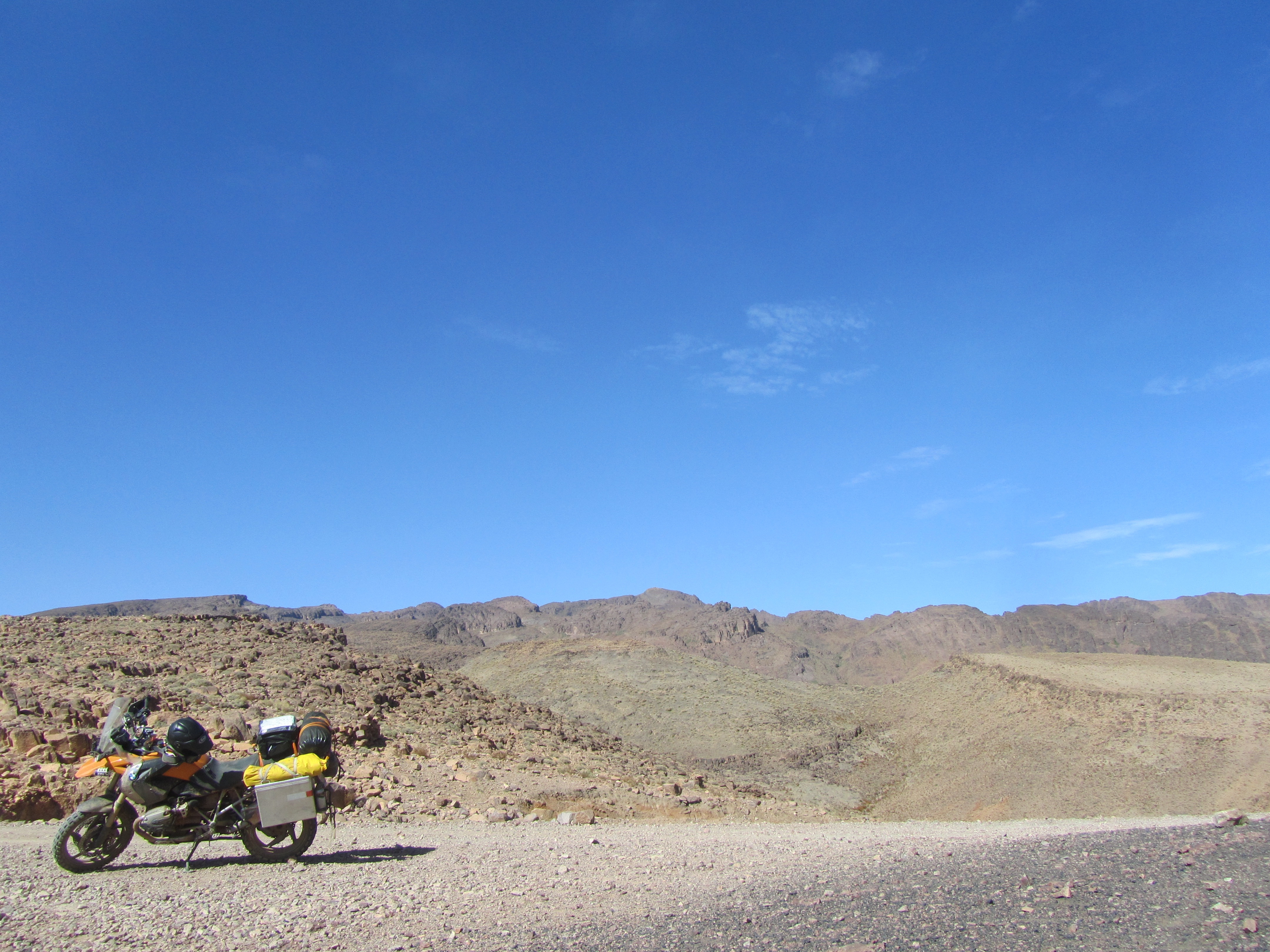 The piste is rock and stone, testing not only suspension, but the steel radial in the tyres as well as the drive train. Again the BMW just keeps rolling along, much more at ease than the exhausted rider. At some otherwise arcane point on the road apart from the gravel surface, the front wheel twists and digs into the gravel, consequence my right foot caught under the pannier, I guess it is a good 100kg, perhaps more. As soon as I am able to free myself, there is a friendly Berber at hand to help right the bike (and I have really come to appreciate the help).