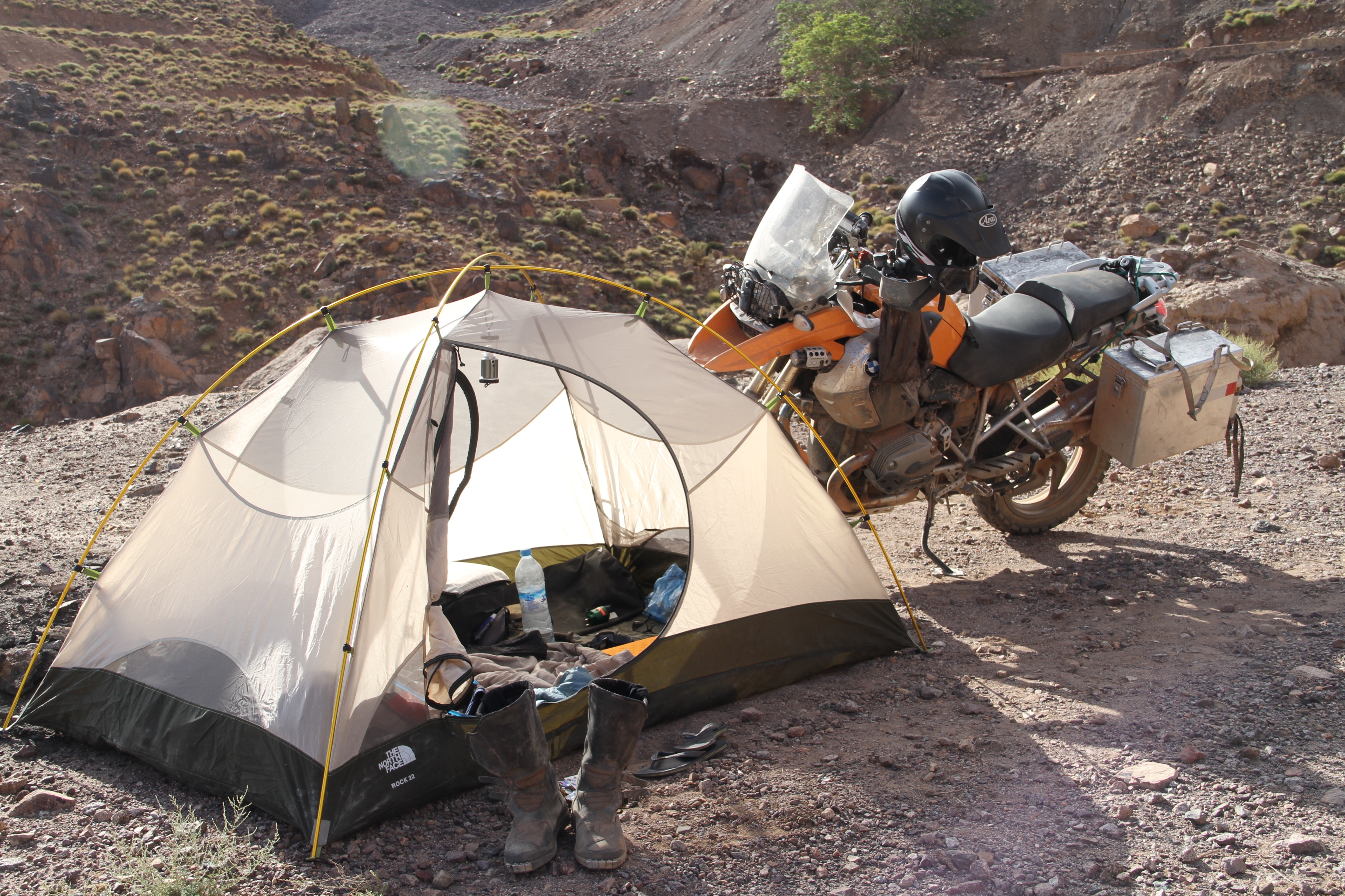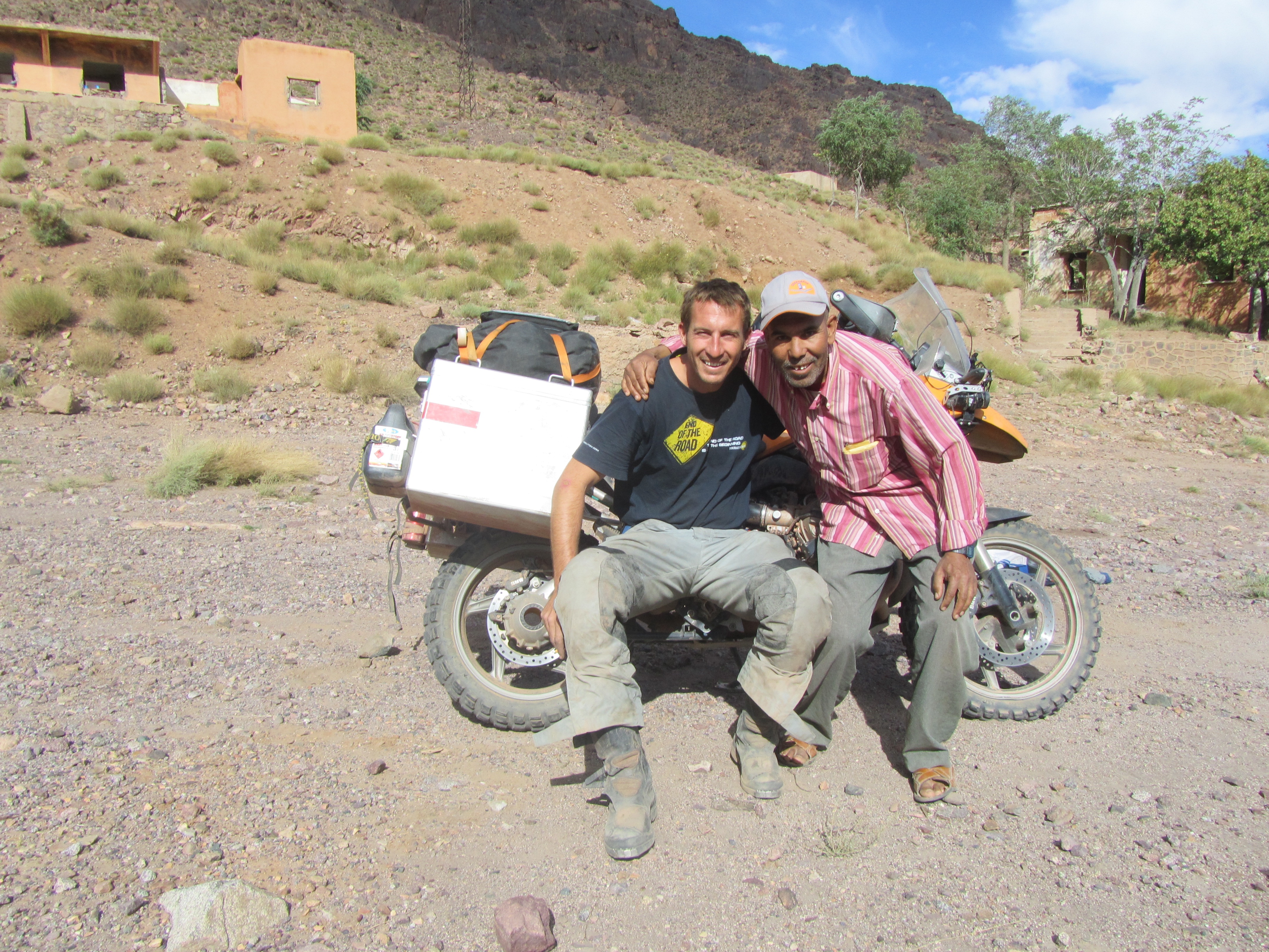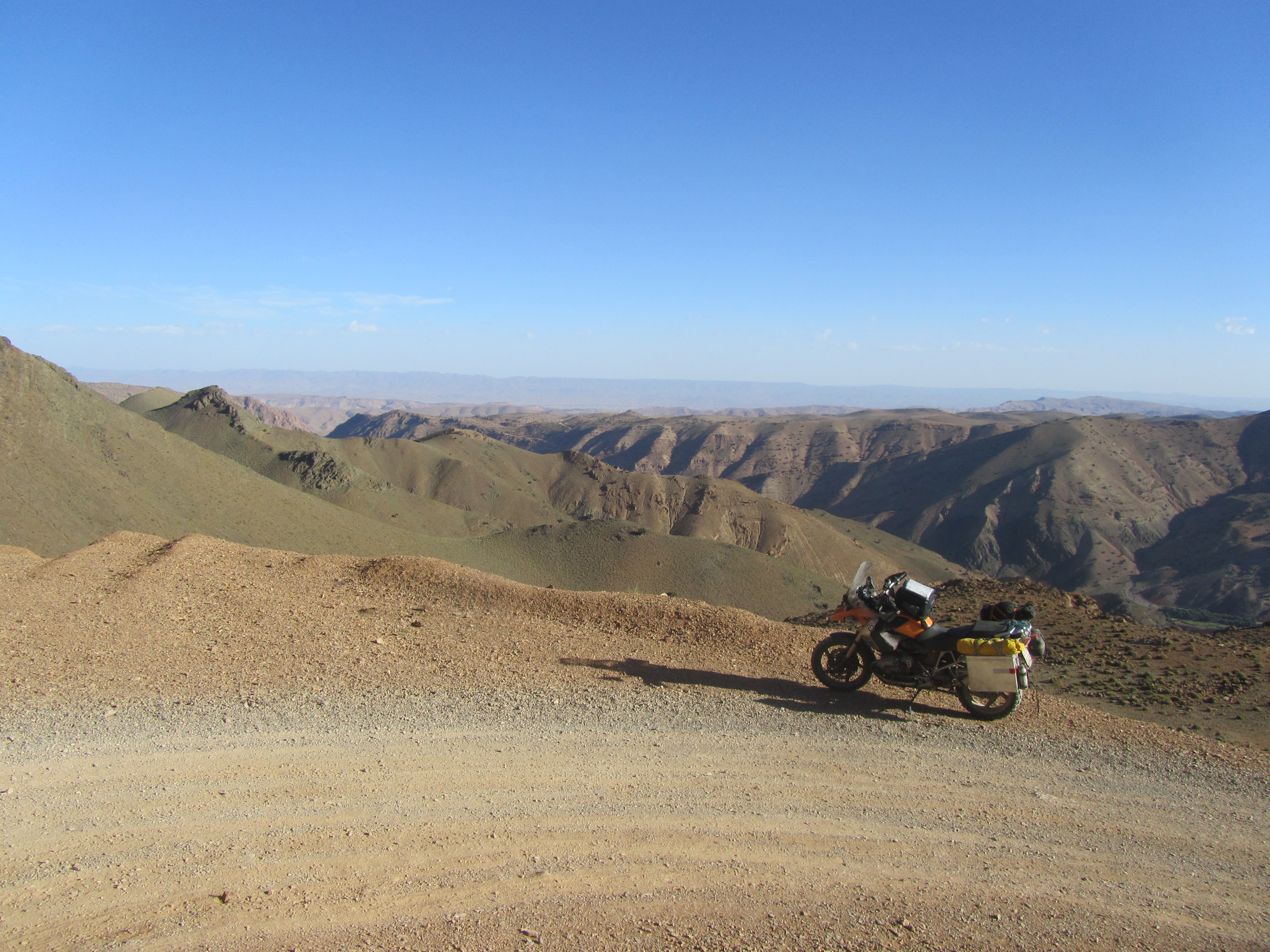 I continue north and a first wrong turn takes me into a river bed and the local kids indicate that the piste is forever down the river bed, so I continue before realising that I am falling victim to the local sport, leading people like me astray. I enjoy the many river crossings and on my return I try to traverse a steep drop and ascent, and on the ascent the lack of profile on the back tyre makes itself felt, and now I am stuck in the river – the thought of all my electronics makes me use full force to keep the bike from falling over. Again, entertainment for the locals, and they help me push the bike up the ascent, all in the water. One of the panniers got damaged during the fall on tar and is no longer watertight. But that does not matter, a little water between engine oil, dust, sand and bread. I return to the main road and at this point all navigation methods fail. The paper map says there is a road north through the Atlas, the GPS map not, and the first Morrocan GPS tells me there is a piste. So I go. I get treated the most beautiful gorge imaginable, only as broad as a single track, driving all along the river bed and into a green valley amongst the palmeraie. It proves the point that a) serendipity makes you discover the most beautiful areas, and b) they are not on maps and c) off road capability helps. I continue up the valley and up a very steep and tight scent up the mountain (Tizi-n Äit-Hamed). My back tyre has limited traction now and on the tight gravelly turns this is starting to become tight and somewhat risky, since mistakes on the steep mountain will be punished severely. Just over the pass I am stopped by a guy wanting a lift to his village. I tell him it is too dangerous on the bike. He invites me to the village to stay with him, but at the same time informs me that the maps indicate that there is a road, but in fact there is not, which is confirmed by a cross-reference (Morrocan GPS triangulation :-)) later on.
